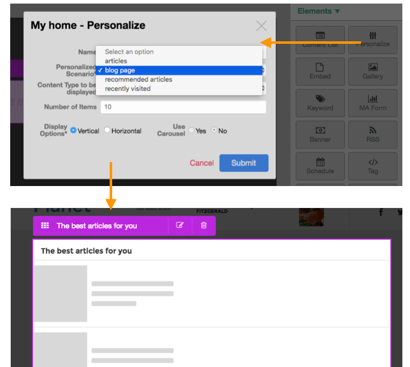 - You can now use eZ Personalization service to create highly personalized landing pages. The Studio Personalization Block available out of the box lets the editor create a block that renders a list of content items personalized to each and every visitor. The interface lets the editor decide which of the Personalization scenarios configured in the eZ Personalization back end, and also the template for rendering, should be used.